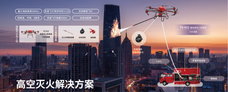 TS-X12是专门针对消防领域高空灭火(包含高层建筑灭火、化工厂、储油罐等)场景研发设计的系留无人机系统。它具备超大载荷、超长续航、抗风能力强、可靠性高,一键起飞、一键降落等功能特点,同时可挂装多种载荷,一机多用,是应急消防领域必不可少的无人机智能装备系统。