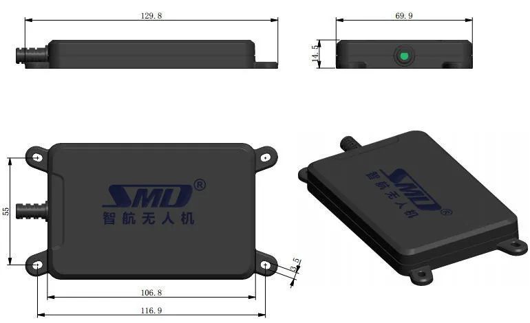 智航毫米波雷达是专门针对固定翼无人机推出的无人机避障系统,采用24GHz频率进行工作,最大测量距离可达200m ,测量精度优于2cm 、体型小巧、灵敏度高、重量轻、性能稳定,实时输出无人机到前向障碍物的距离,抗干扰能力强,能工作于全天候环境。