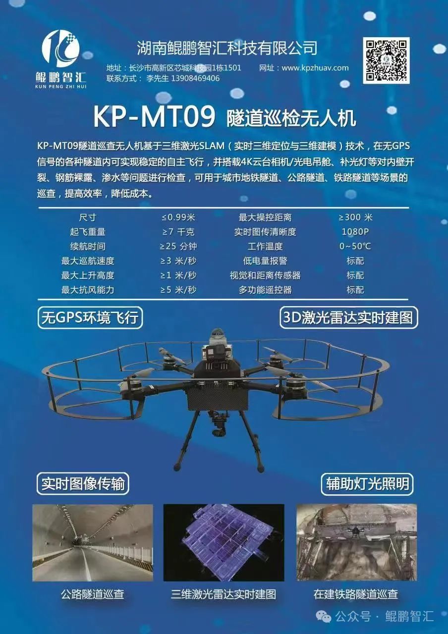 公司KP-MT09无人机,搭载三维激光雷达、高清视频吊舱、高清相机等多种设备,在地铁隧道完成飞行巡查,采集多类地铁结构信息用于智能化感知与监控分析。该无人机具有飞行时间长、载重量大、抗干扰能力强、防碰撞性能全面等优点,出色完成该项目的地铁隧道飞行巡查任务。