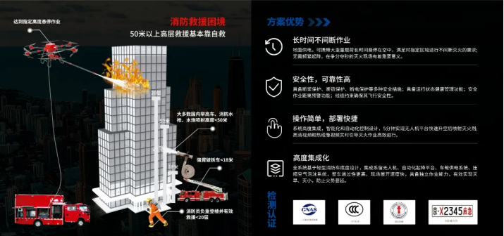 其具备超大载荷、超长续航、抗风能力强、可靠性高,一键起飞、一键降落等功能特点,同时可挂装多种载荷,一机多用,是应急消防领域必不可少的无人机智能装备系统。