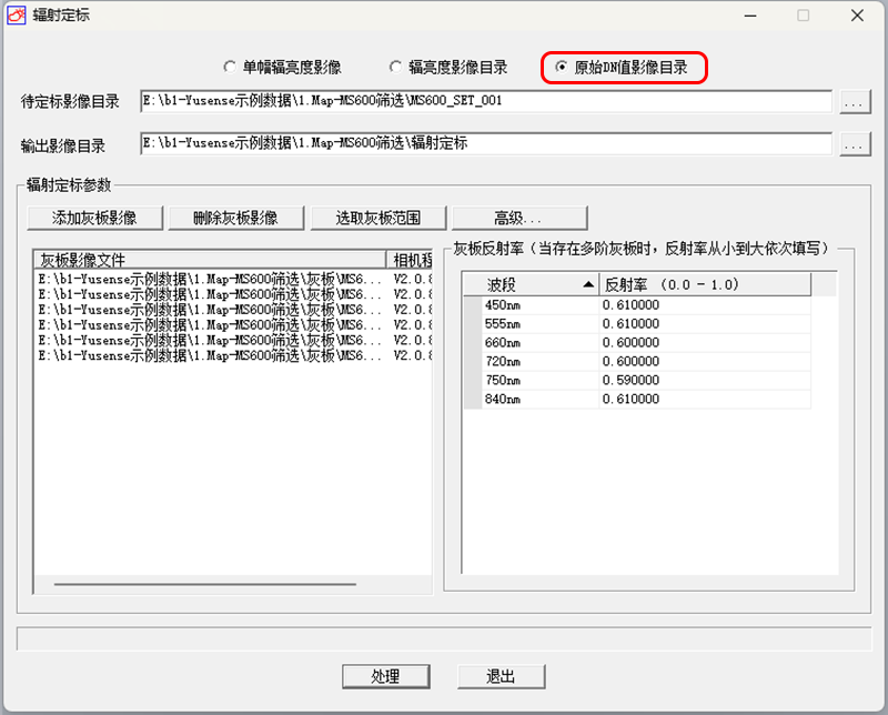 备注:1. 流程化工具暂不支持处理AQ300系列相机数据,请使用软件“波段配准、影像拼接、辐射定标”功能分步处理;2. 辐射定标工具暂不支持AQ300系列相机数据灰板范围的自动识别,请手动选取灰板范围进行辐射定标。