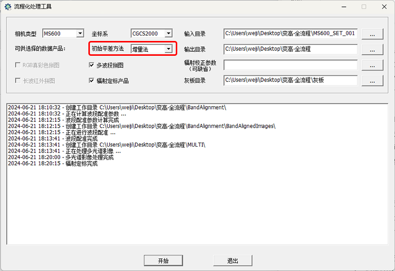 为优化变高飞行数据的预处理体验,V2.2.5版本流程化处理工具新增支持Pro版相机(MS600 Pro、AQ600 Pro)变高飞行数据的处理(选择“增量法”),精简用户手动操作流程。