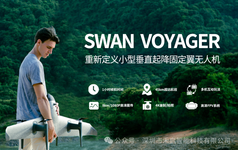 SWAN VOYAGER是首款将3轴云台增稳技术应用于超小型消费级垂直起降固定翼的航拍无人机。VOYAGER支持4K视频录制、图传距离超过8km,飞行时间超过1h。使用VOYAGER,用户可以随心所欲的创作,从此告别图传距离短以及续航焦虑的困扰。