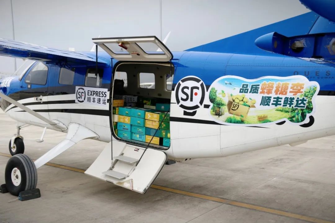 早晨8时30 分,一架由满载贵阳蜂糖李等特色经济产品的通航飞机,从贵阳龙洞堡机场起飞,在飞行2.25小时后降落在成都(金堂)淮州机场,而后交由丰翼方舟40无人机空运至金堂县科玛小镇,并通过快递员配送至客户手中。