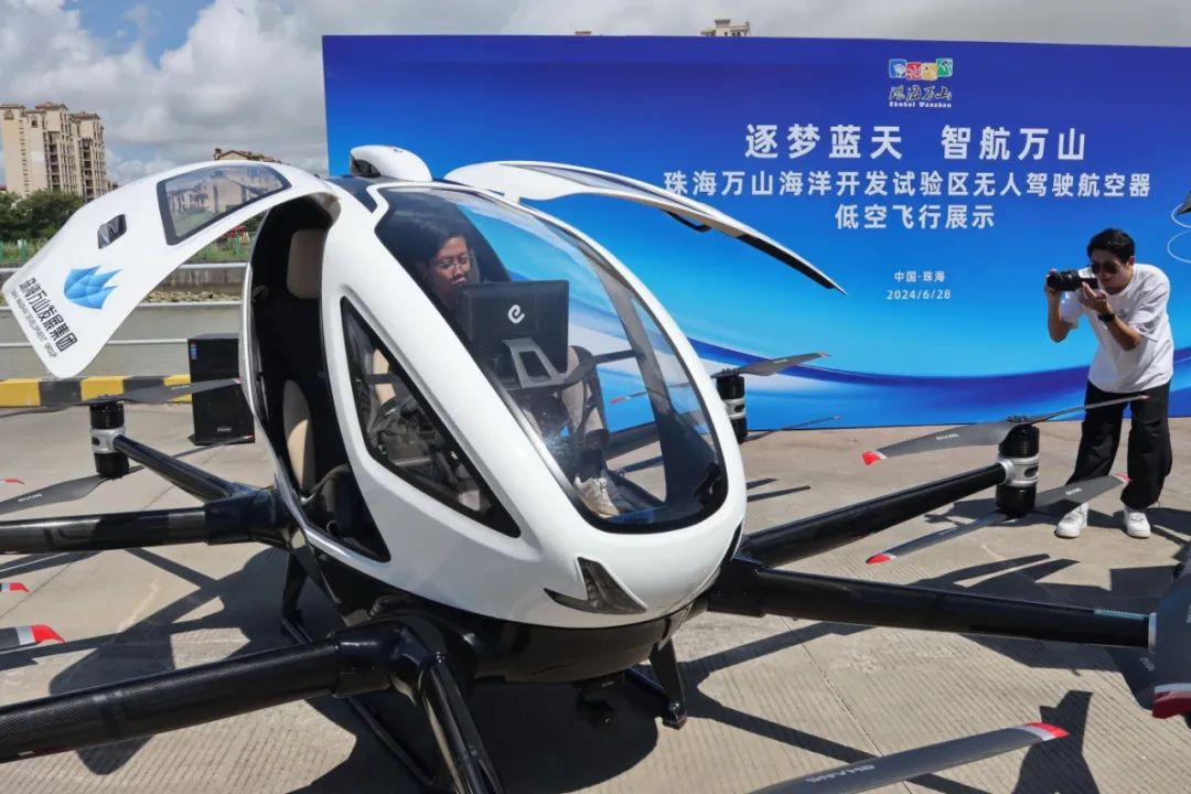 来到唐家港码头,在此处的万山群岛低空经济示范项目基地看到,一架物流无人驾驶航空器VT-24L和一架无人驾驶载人航空器EH216-S正在进行飞行展示。
