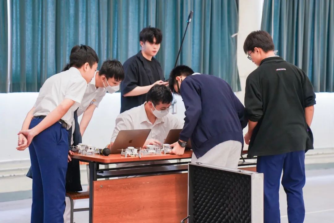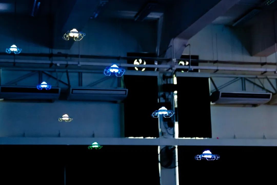 搭建工作完成后,由队长举手示意开始进入表演阶段。当音乐响起,无人机升空,随着节奏演变出不同图案,此时昏暗的赛场化为夜空,无人机成为了最亮的星群。