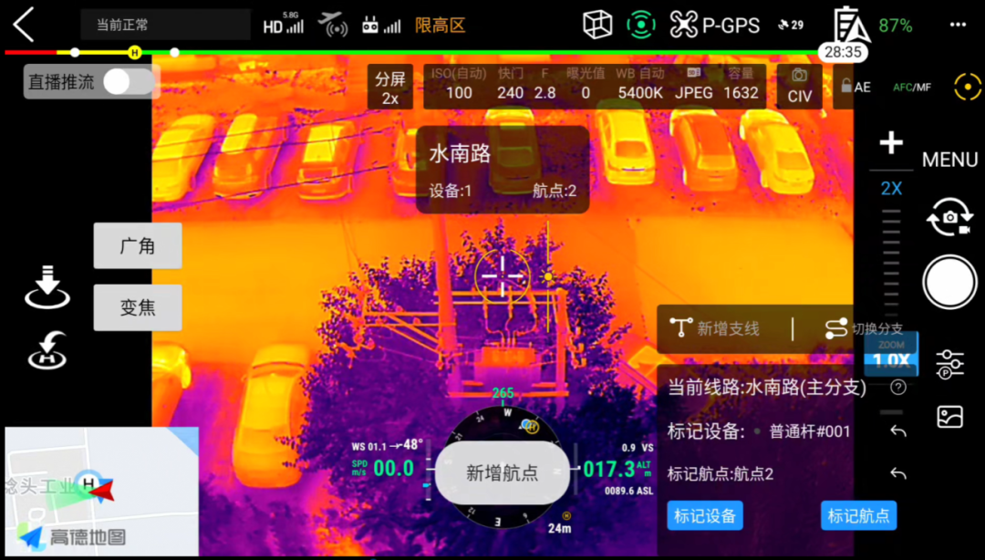 无人机巡检飞行期间,搭配配套APP,可以精准标记电网线路上关键设备的具体位置坐标。系统自动实时捕获无人机的姿态参数与云台运动数据,在后续的二次巡检任务中可直接调用,有效提升了巡查效率与数据复用性。