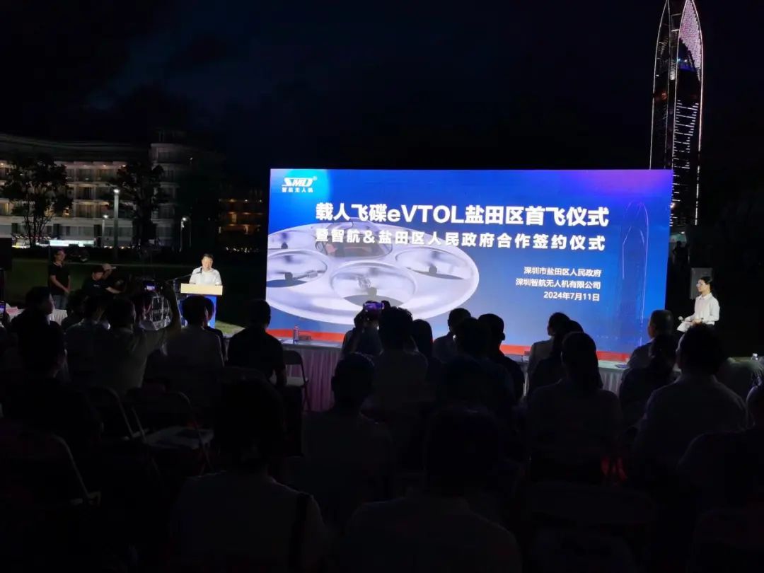 7月11日晚,智航飞碟eVTOL盐田区首飞活动在大梅沙海滨公园举行。盐田区委书记李忠,粤港澳大湾区新兴产业发展研究院院长龚晓峰,盐田区委常委、副区长高东春,盐田区委常委、区人武部部长王贵喜,盐田区副区长简政参加活动。