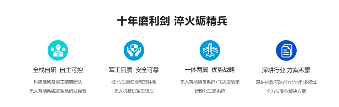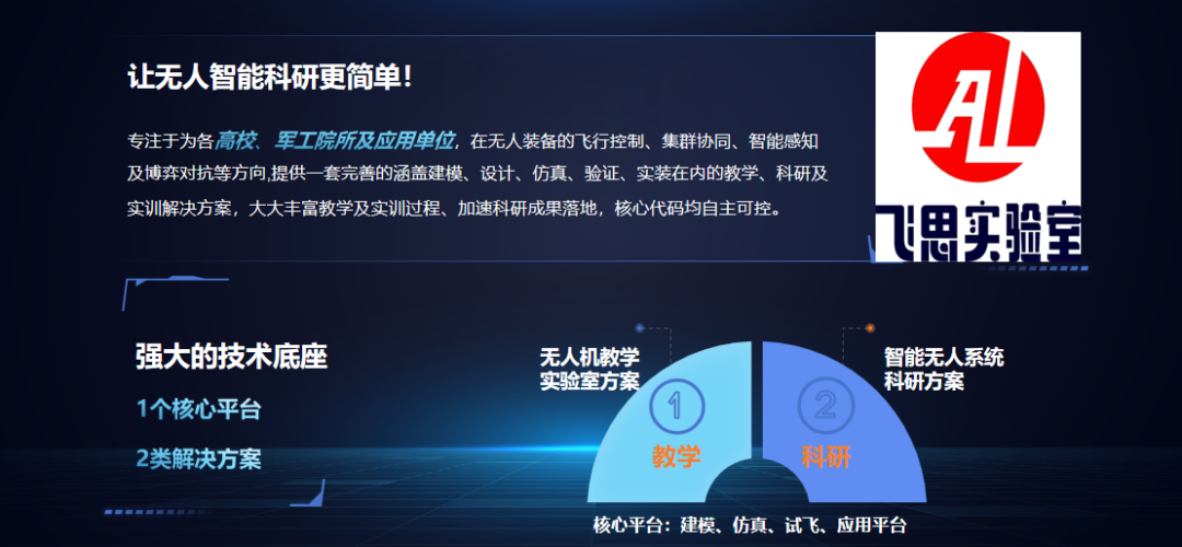 “一体两翼”业务模块,无人智能装备系统+飞思实验室。核心产品包括单机无人装备、集群无人系统,无人机仿真平台等,应用涵盖国防、教育科研、应急消防、水利林草、电力、石油与天然气等领域。