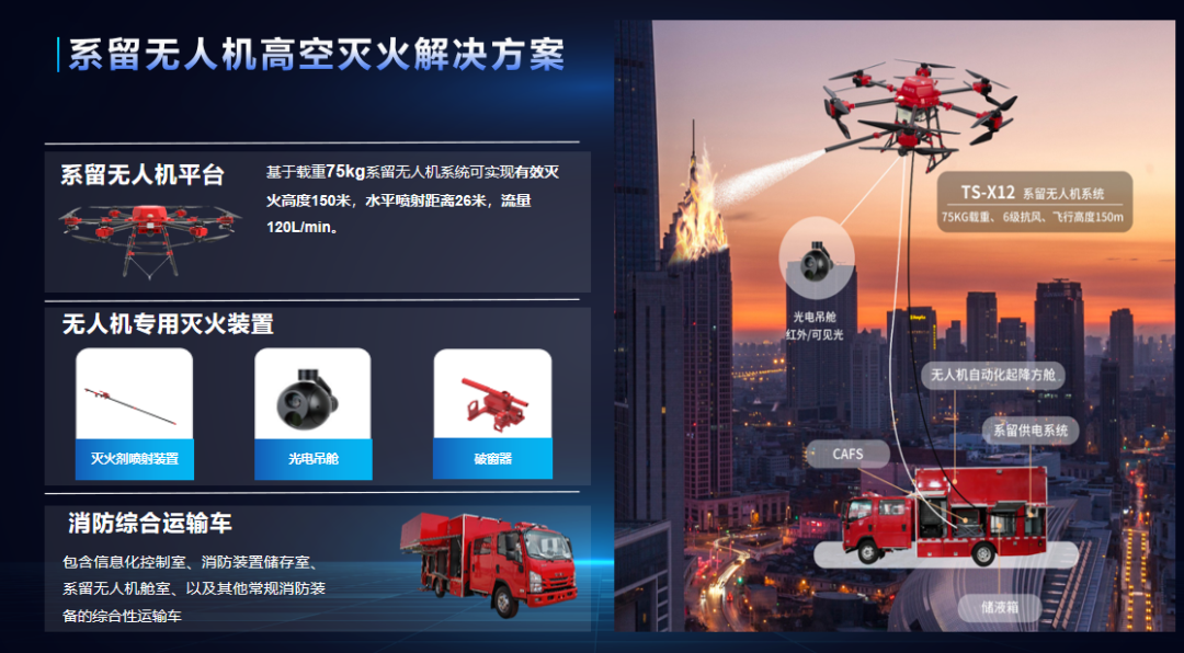 2023年,车载系留无人机高空灭火系统获工信部公告及消防3CF认证,同年,高空灭火系留无人机批量交付。TS-X12系留无人机系统是国内目前实现商业化应用中唯一的系留高层灭火救援装备,并在多次实战演练中得到验证。