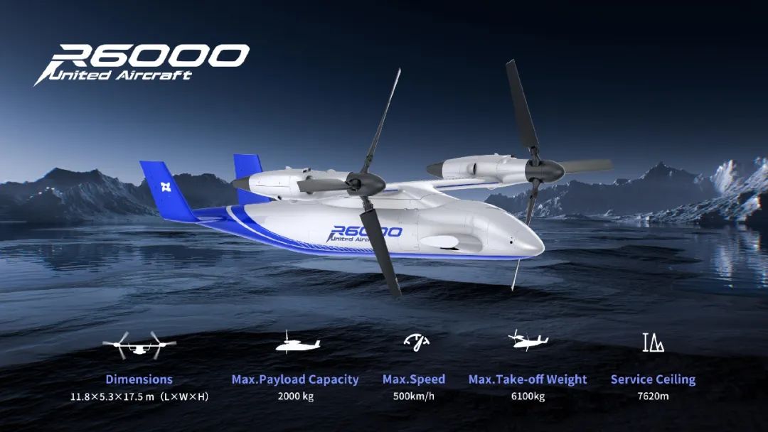 R6000兼具直升机垂起悬停与固定翼航速航程优势,大载重 、高航速、航程远,最大载重可达2吨,航程、航速均达到直升机性能指标的2倍。不受地形和跑道限制,在山区、岛屿等特殊地形也能执行任务,结合各类舱室和载荷设置,在商务出行、应急救援和物资运输等场景中,可承担载人载货的多样任务,运输效能高。