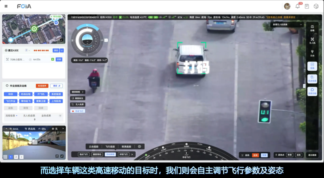 选择车辆等高速移动的目标时,无人机根据目标移动速度和方向,动态调整飞行参数及姿态,确保目标持续处于视野中。
