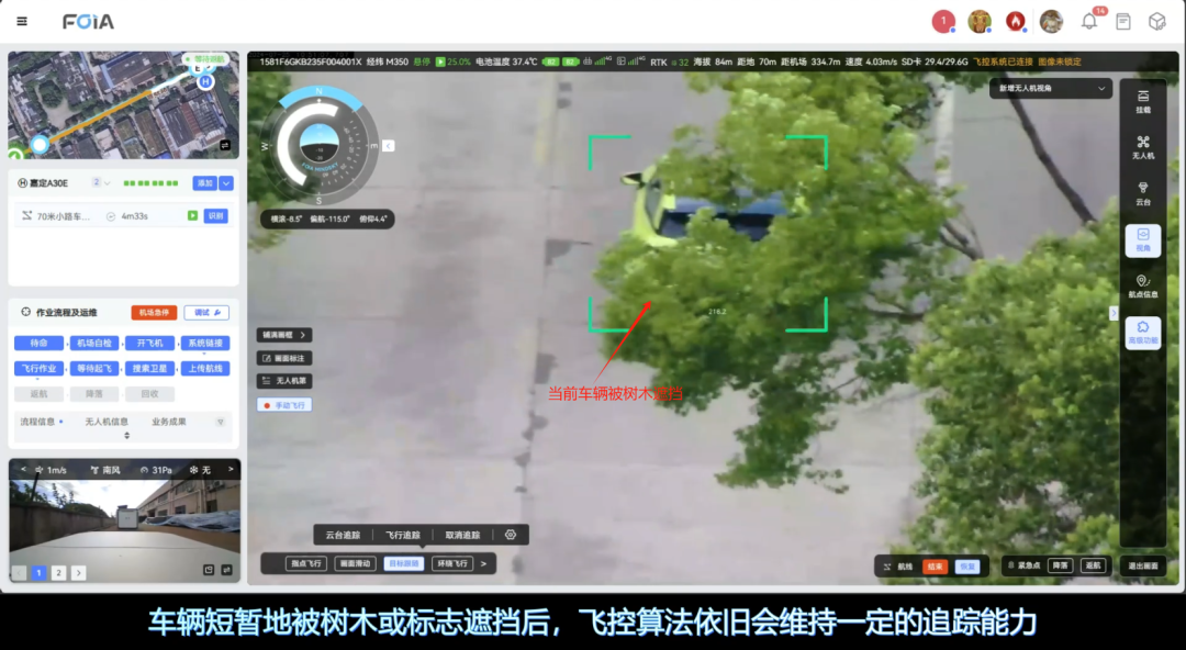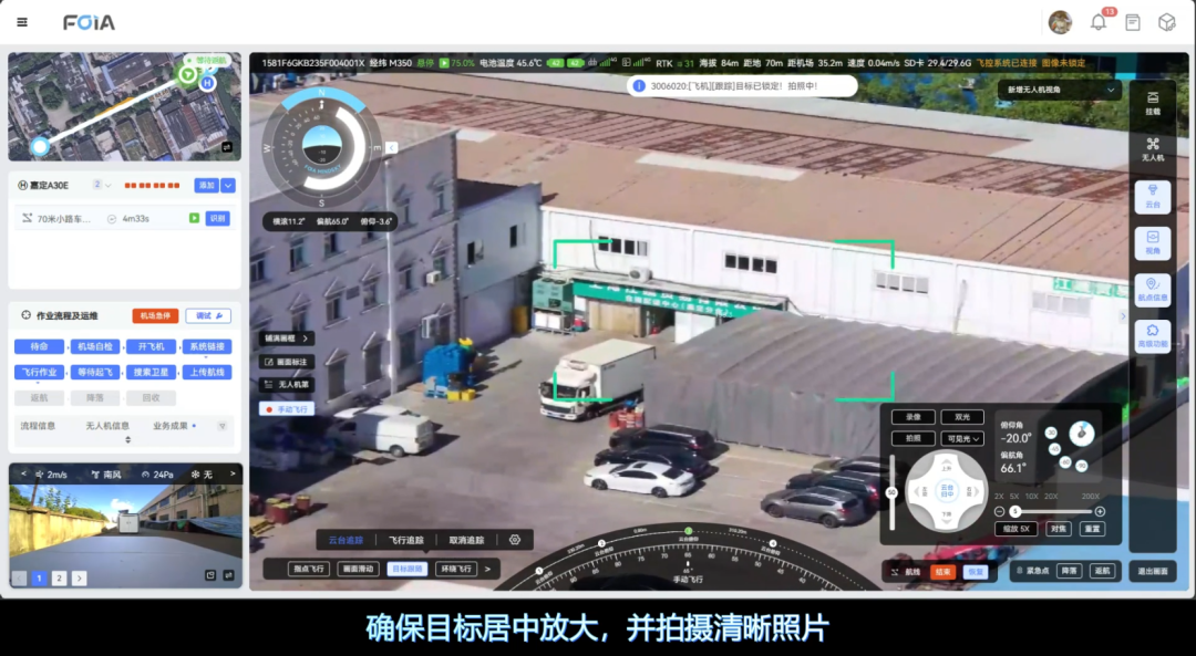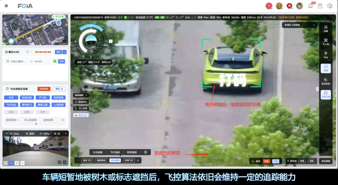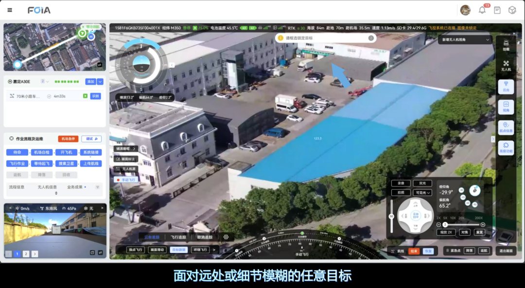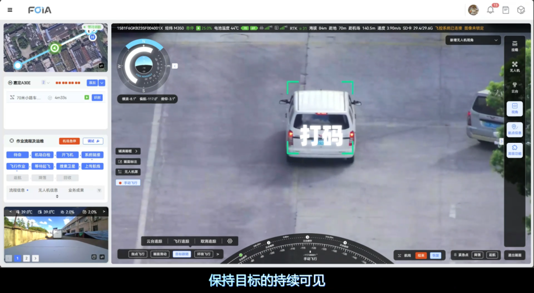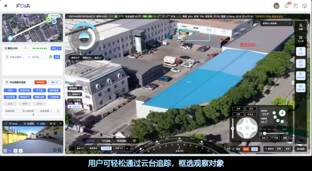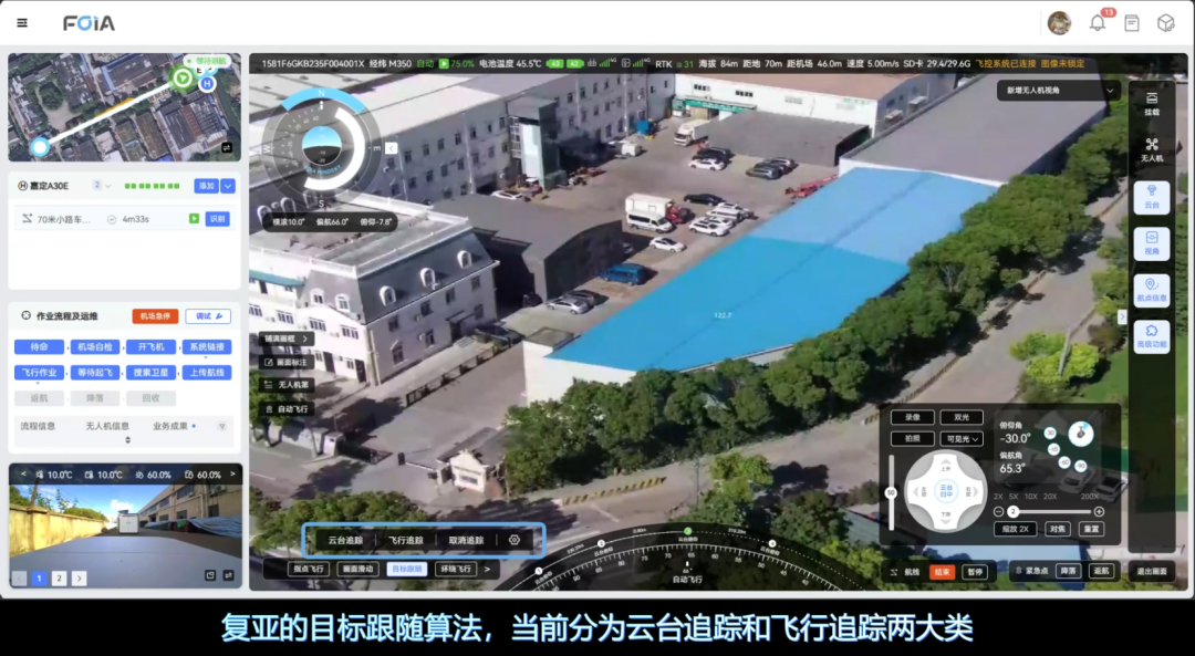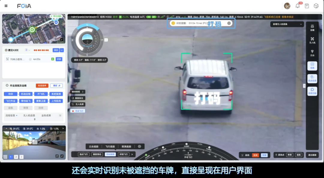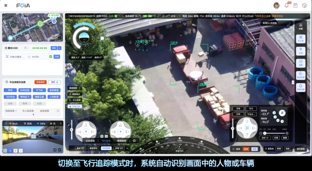 复亚智能的目标跟随/车牌实时识别功能,由云台追踪和飞行追踪两大核心模块组成。云台追踪面向远处或细节模糊的目标,通过调整摄像头的角度和焦距实现对目标的放大观察;而飞行追踪则主要应用于特定目标的监控,根据目标的移动自动调整飞行参数和姿态,实现对高速移动目标的持续追踪,掌握目标动态。