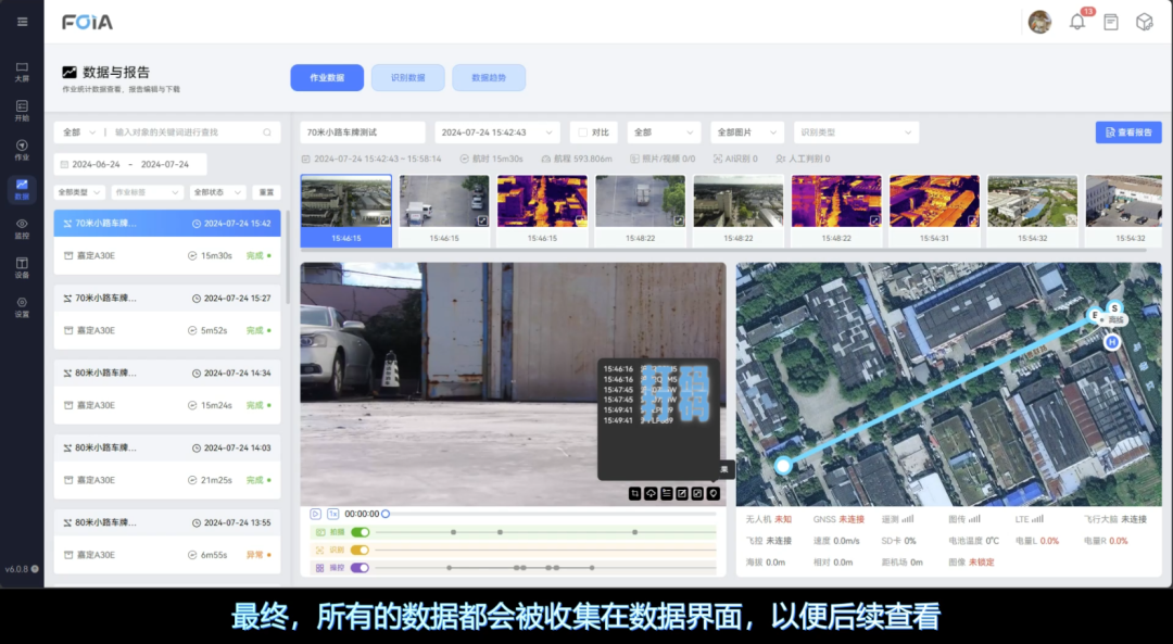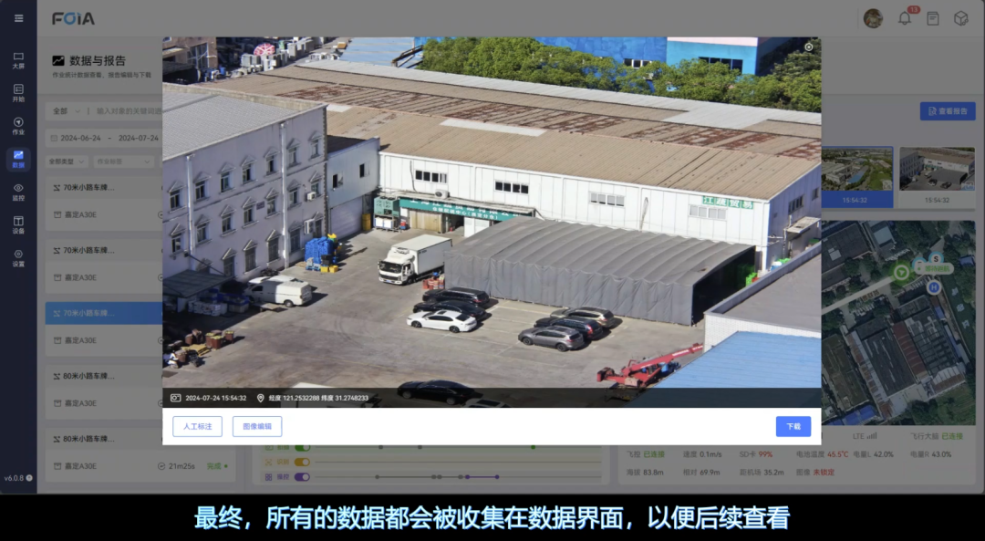 结果汇总:任务中的照片及识别信息等所有数据都会呈现在在数据界面,任务结束后支持查看、回放、下载报告等,提供多维的数据支撑。