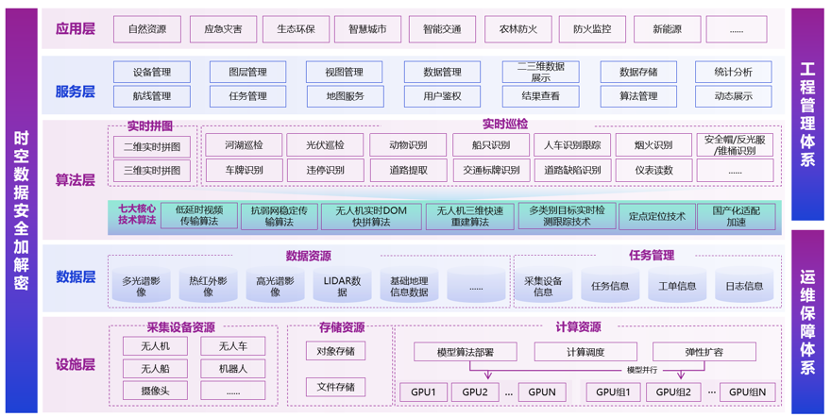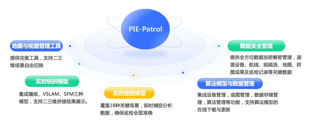 该产品具有地图与视图管理工具、实时快拼模型、实时巡检模型、算法模型与数据管理、数据安全管理五大功能: