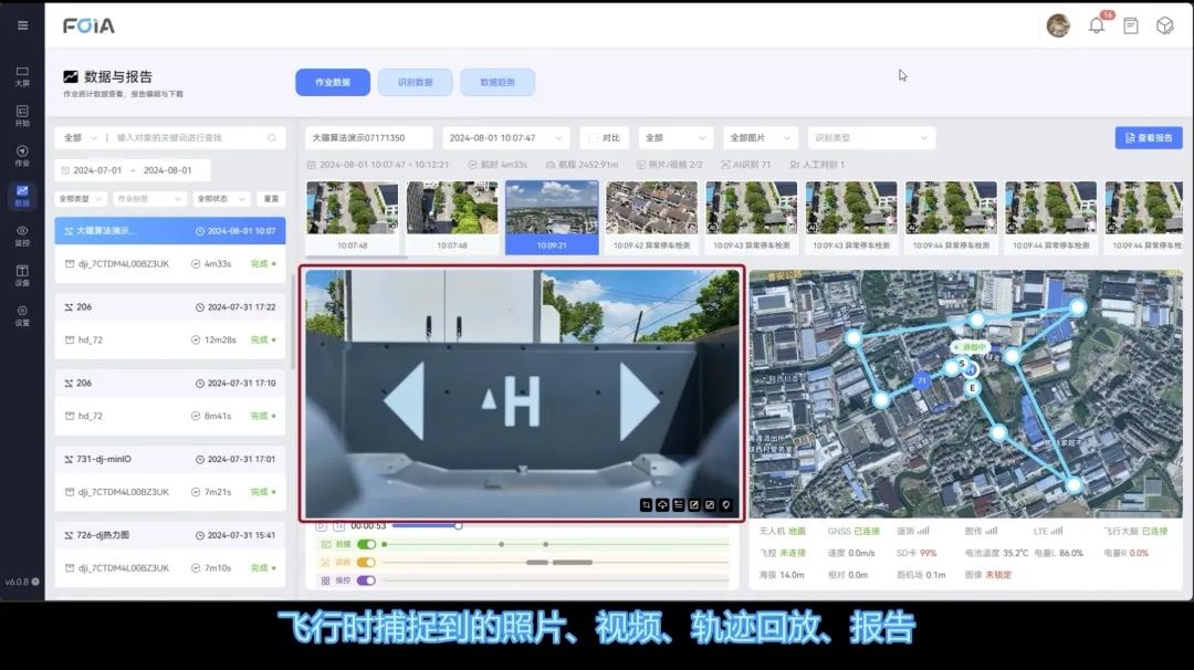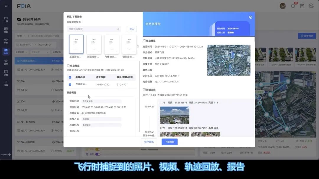 通过复亚智能无人机管理平台,在无人机飞行过程中,系统自动捕捉并上传照片、视频、轨迹数据,乃至每一个手动操控及识别信息,都将实时在平台展示。