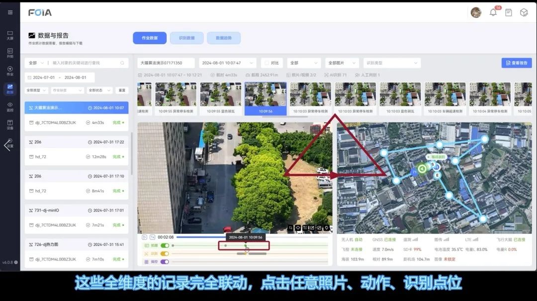 在复亚智能无人机管理平台上,用户可点击任意照片、动作或识别点位,查看对应的飞行画面和轨迹位置,帮助用户快速理解飞行数据的关联性和整体情况。