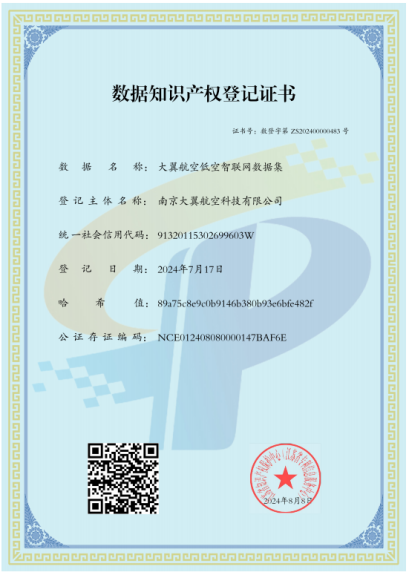 2024年7月,我司“大翼航空低空智联网数据集”成功在江苏省数据知识产权登记中心完成审核流程,荣获《数据知识产权登记证书》。