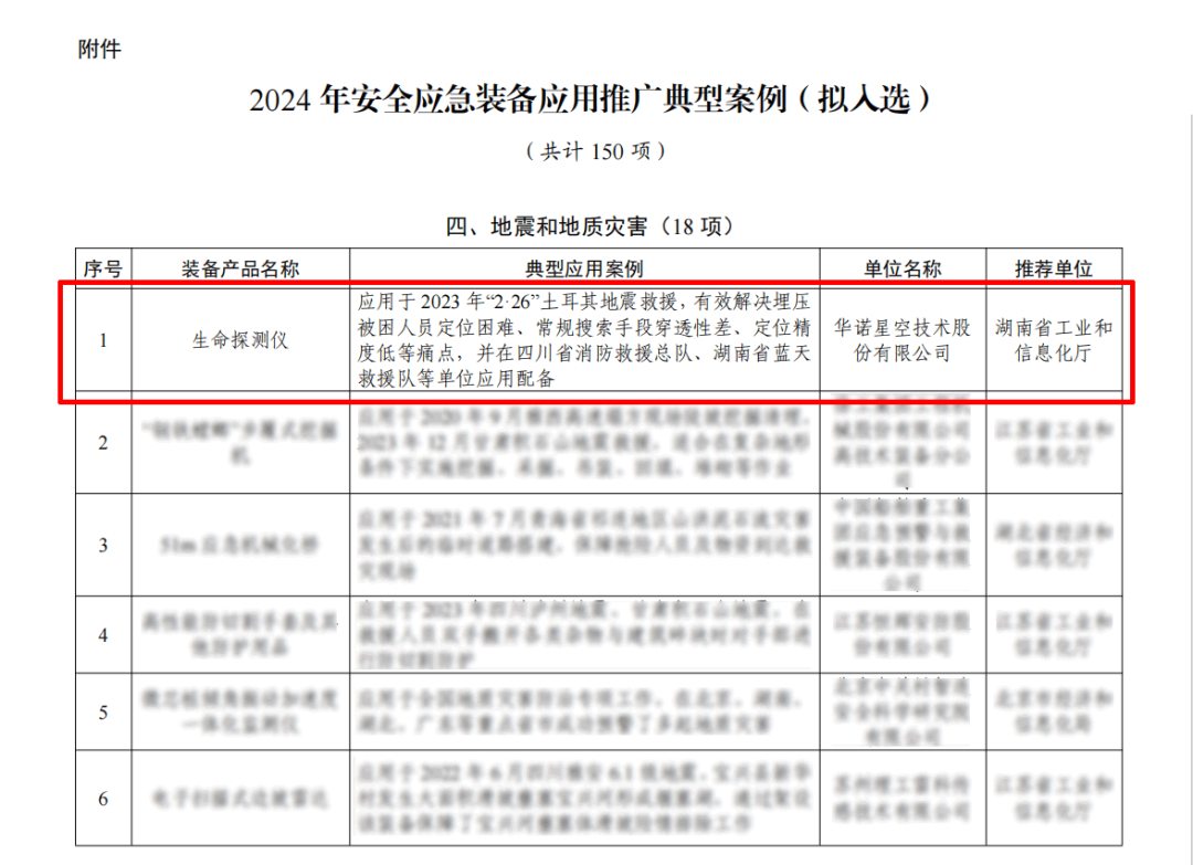 作为国家首批“国家应急产业重点联系企业”,华诺星空自成立以来始终致力于“共建安全的世界”的企业使命,不仅自主研发了多模复合生命探测仪、边坡雷达等多款高科技产品,还自发建立了企业公益救援组织——“华诺奇迹救援队”并参与了2010年玉树地震、2022年“4.29”长沙居民自建房倒塌、2023年“7.8”湖北五峰山体滑坡等多项救援行动,提供了可靠的技术保障。本次典型案例的成功入选,不仅是对我司深耕安全应急领域相关工作的肯定和认可,更彰显了公司的社会责任感和专业能力。