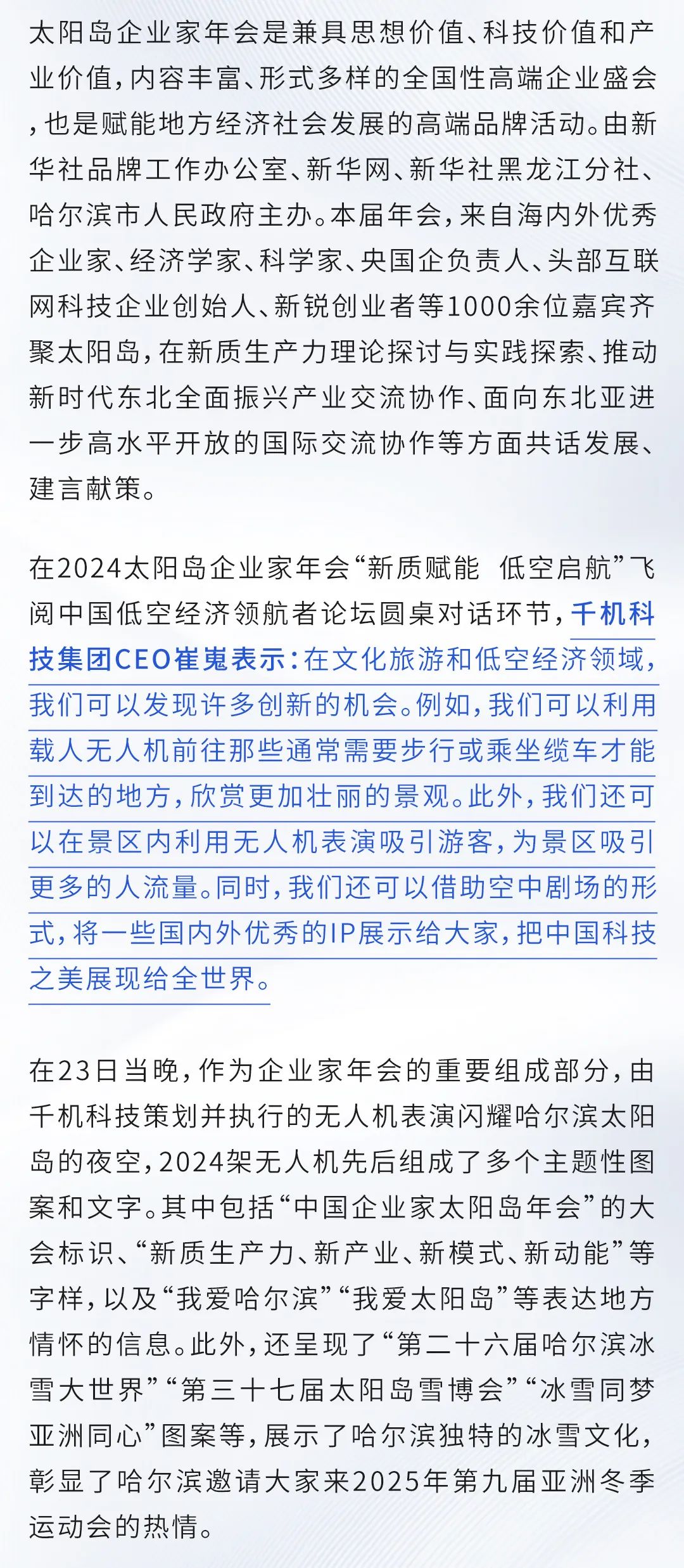 新质赋能,低空启航!千机科技携手新华社助力哈尔滨太阳岛企业家年会!