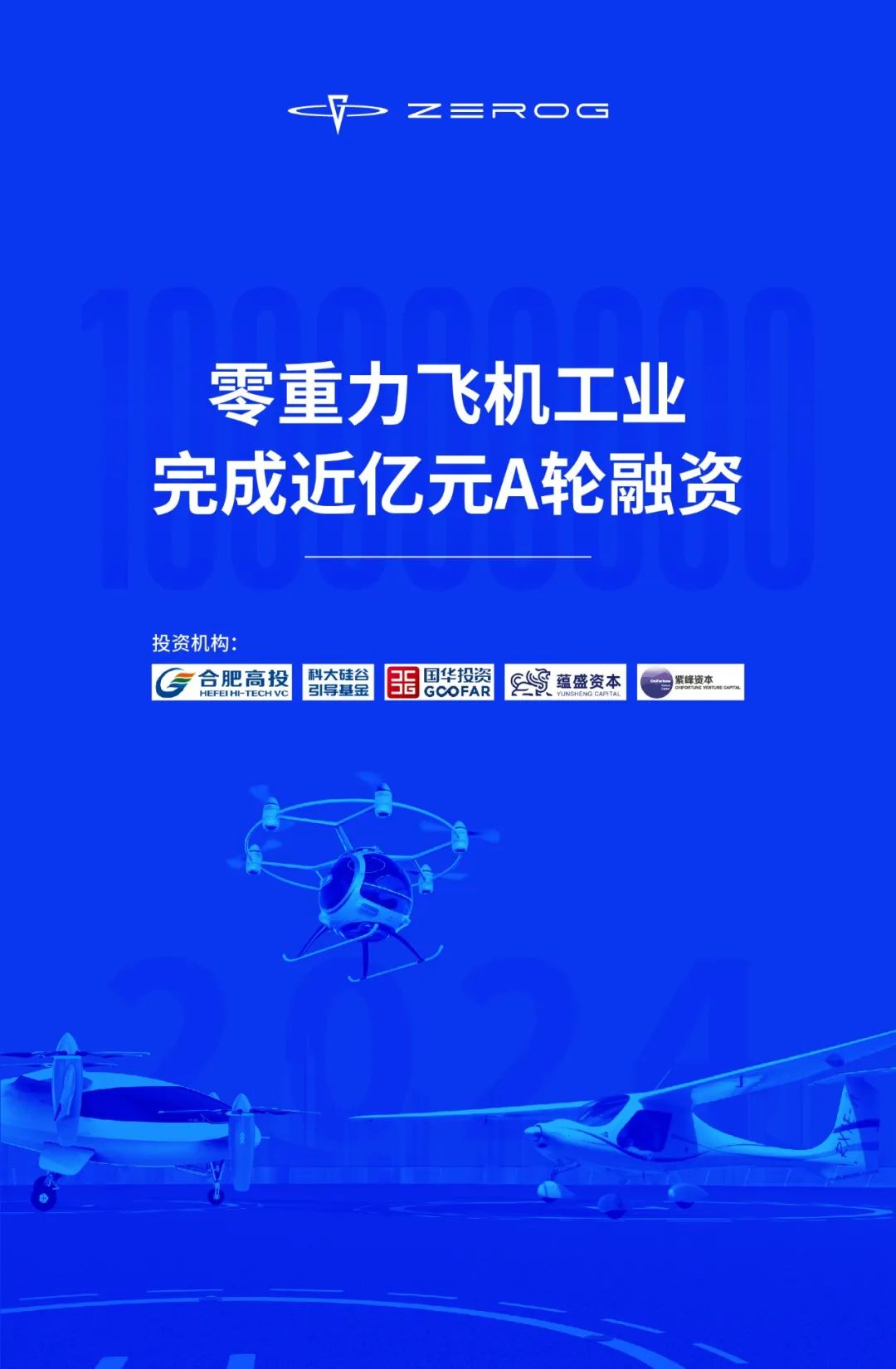 【零重力飞机工业(合肥)有限公司(“零重力”)近期完成近亿元人民币A轮融资,由合肥高投领投,科大硅谷引导基金、国华投资、蕴盛资本、紫峰资本跟投。】本轮融资聚焦零重力eVTOL项目,为多旋翼ZG-ONE的适航取证、倾转旋翼ZG-T6全尺寸机的全状态飞行提供资金支持,进一步加速旗下电动固定翼飞机RX1E-A等多款新能源航空器产品的商业化进程。