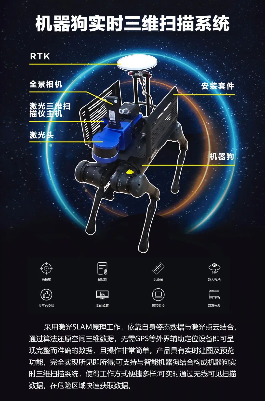 最令人瞩目的莫过于鹏锦科技带来的机器狗表演。这款机器狗集成了先进的自主导航、环境感知与智能决策技术,能够在复杂环境中灵活穿梭,执行测绘任务。其精准的定位能力、稳定的行走性能以及强大的数据处理能力,赢得了现场观众的阵阵掌声,展现了未来测绘技术的无限潜力。