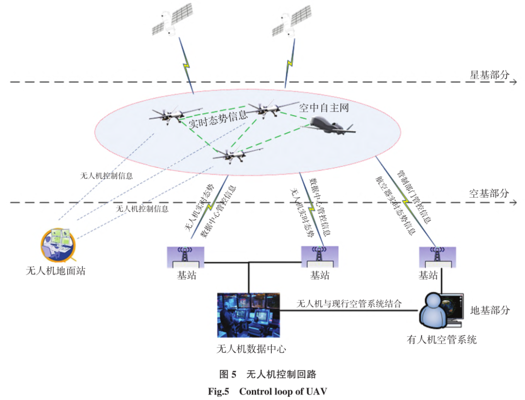明确无人机交通控制3个回路的控制分工及协同、优先权限、各自作用等,包括:①空中自主网下的分布式管制;②地面集中式管制;③地面分布无人机控制站操作员、空中有人机驾驶员、地面管制中心管制员的分布协同控制,无人机交通控制回路如图5所示。