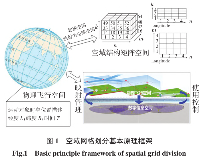 空域网格划分是要建立一种全新的空中交通管理与战场空域空间的四维时空框架,如图1所示,将物理空间通过空域规则划分后,利用空域网格体及信息空间的映射矩阵空间,管理空中交通的空间几何结构和空域结构;利用空域划分建立的全球唯一位置码,建立空中交通和战场空域的时空大数据库,管理和监视空中安全态势、容量态势及空中运动演化态势,为空中交通管控决策提供数据计算方法等。