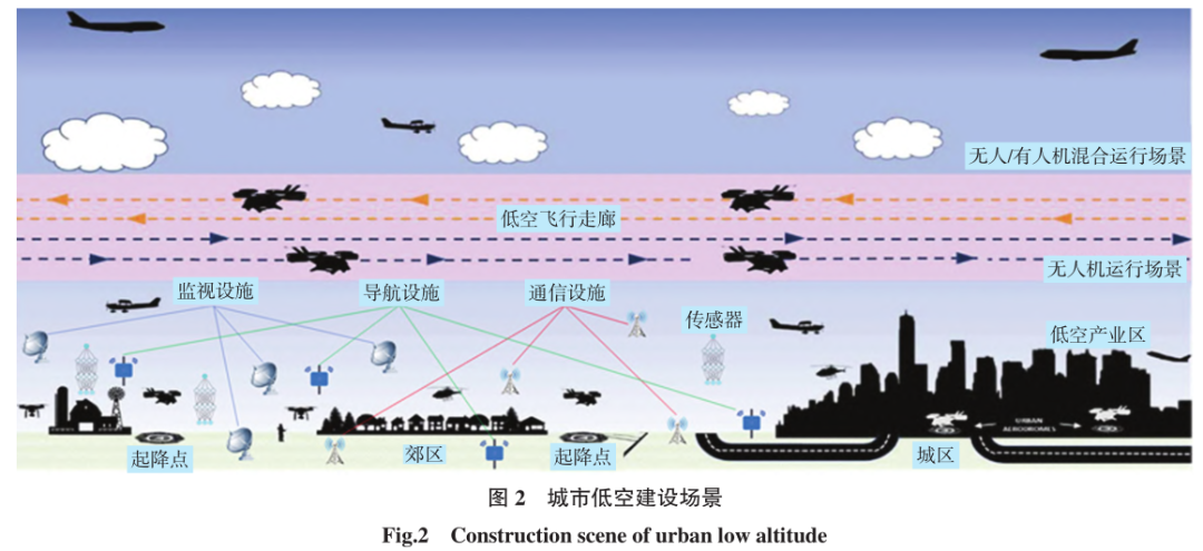 城市低空网络按照分层覆盖,并融合卫星通导,构建空天地一体化网络,支持地面汽车和无人机一体化运行;从陆-空协同角度看,地面车、地表近空与低空各类无人机和通航有人飞机的混合运行是一种跨域异质交通场景,存在不同尺度的速度和运行控制响应时间要求。城市低空建设场景如图2所示。