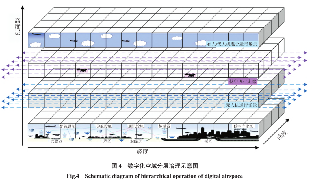 本文按照分类的思想,将运输航空、军事航空、通用航空器的空域管理及配套体系建设分开规划,从无人驾驶航空器的空域进入需求看,必须统筹考虑,推进以空域系统分层治理为核心的空管体系建设论证,可考虑在数字化网格空域的基础上进行空域分层治理,如图4所示。