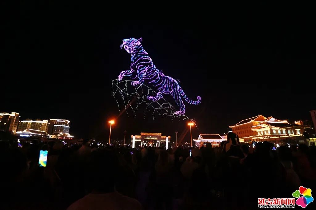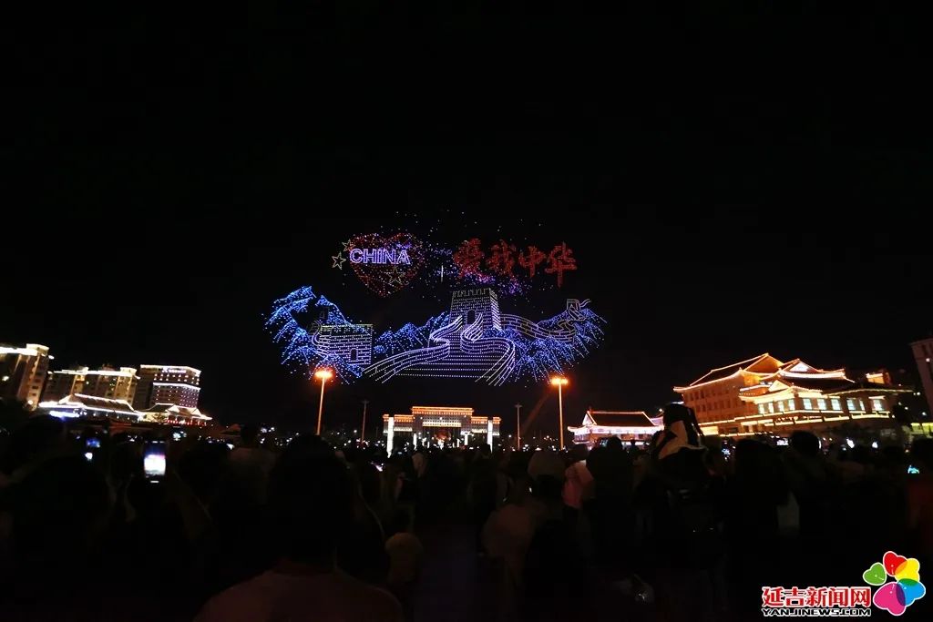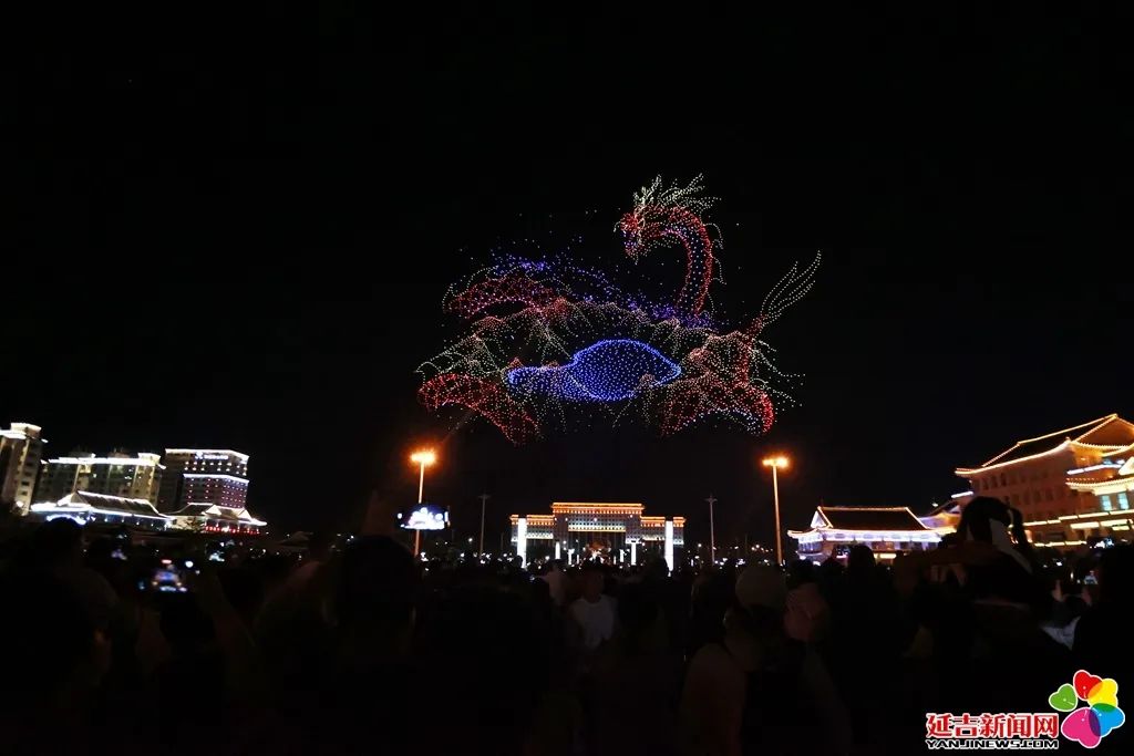 19时30分,无人机群在夜空中编排出以“爱我中华”“华夏巨龙腾宇穹”“长白山四时之美”“金达莱花海”“朝鲜族少女鹤舞旋转”“五个延吉”“庆祝延边朝鲜族自治州成立72周年”等造型和字样,展现了科技与艺术的完美融合,为市民和游客呈现了一场光影交织的视觉盛宴。