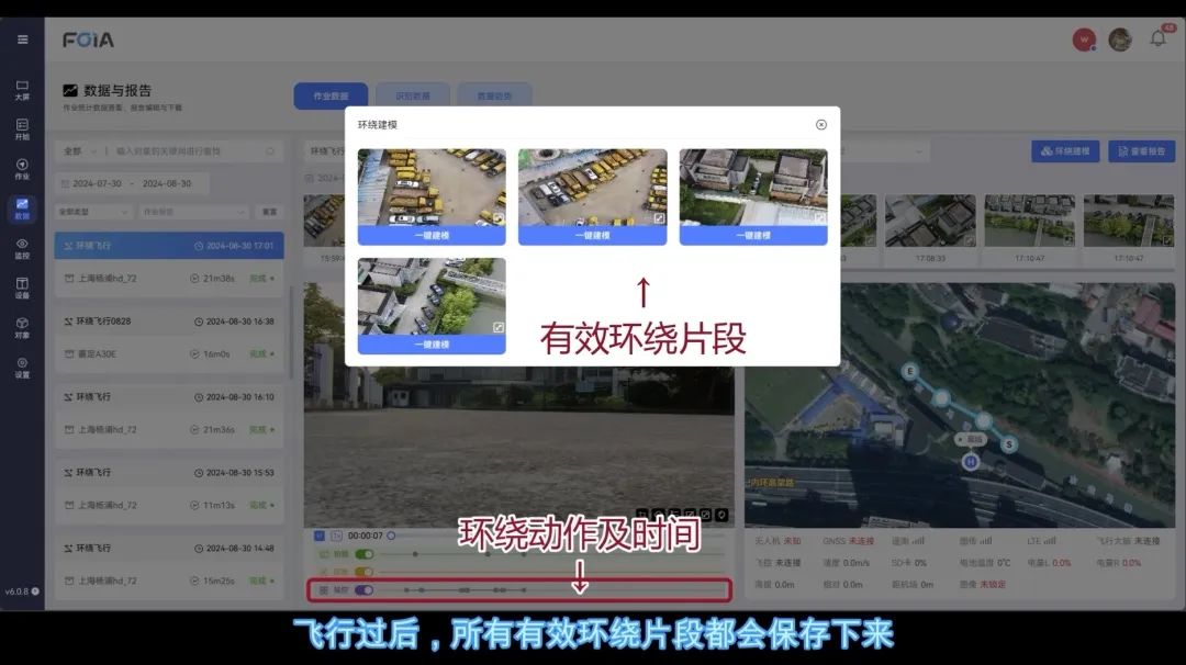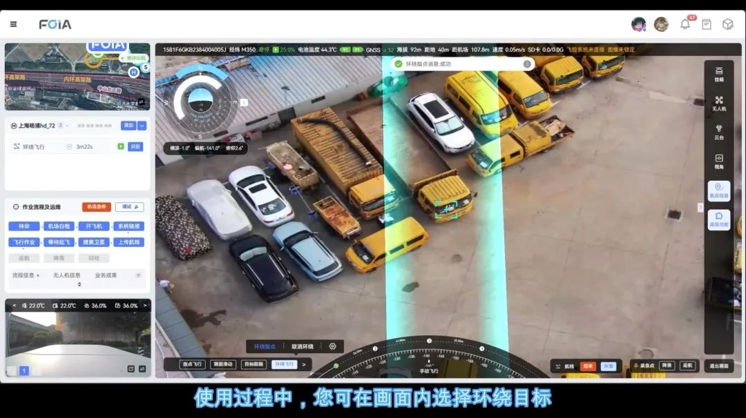 系统会根据用户选择,自动调整无人机的姿态和飞行路径,对目标进行环绕飞行,采集1-2分钟的高质量视频数据,并在平台上实时显示视频与地图上环绕的圆形轨迹。