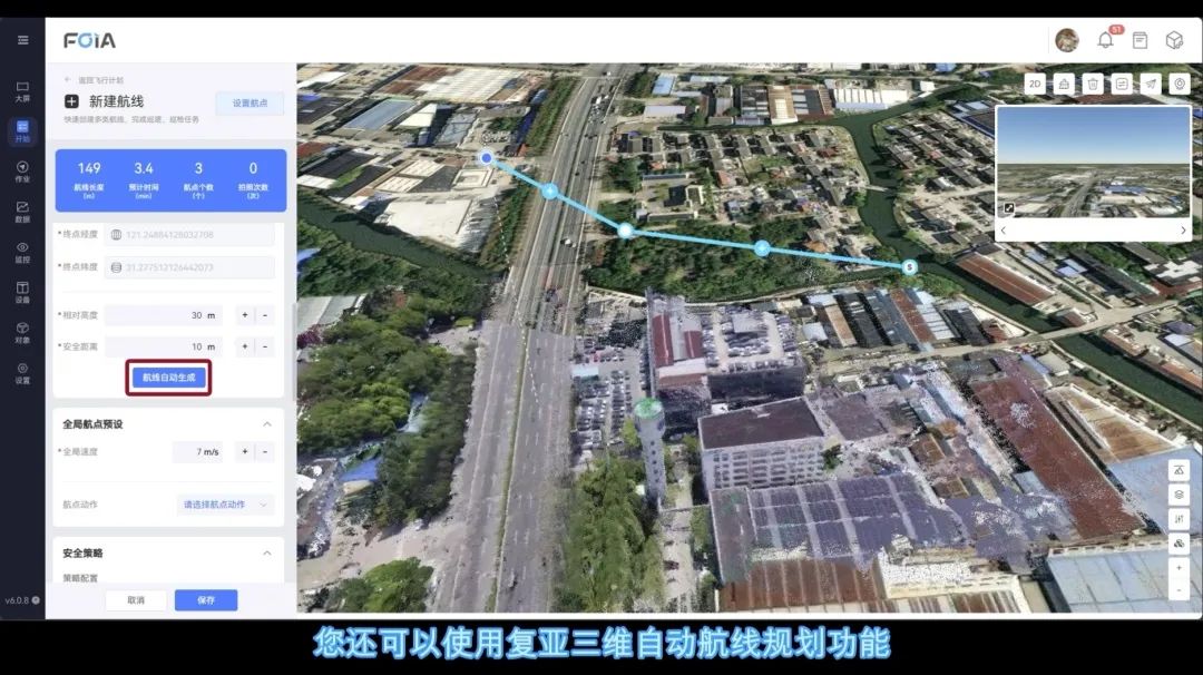 特别是当飞行路径区域已经完成建模时,用户可以使用复亚智能的三维自动航线规划功能,基于模型一键生成仿地航线,与实际地形高度契合,确保飞行路径的精确性和安全性,并大幅减少规划时间。