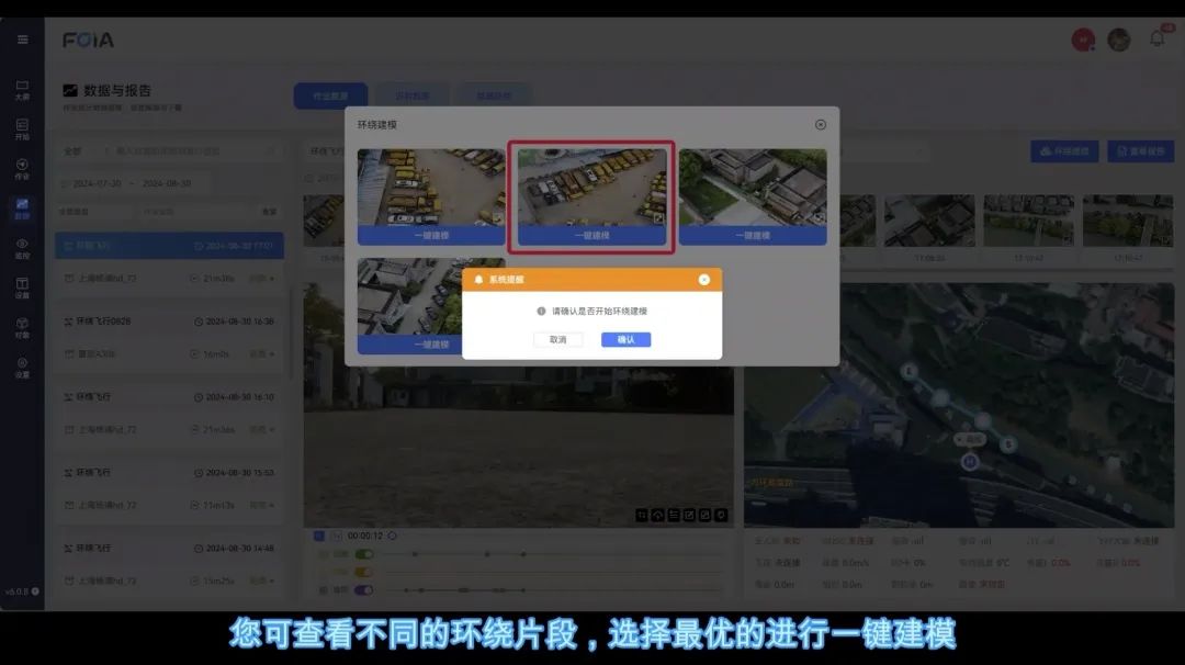 完成环绕飞行过后,所有采集到的有效环绕片段都会保存至复亚无人机管理平台,用户可以选择最好的片段,然后系统针对所选的片段自动启动建模算法。