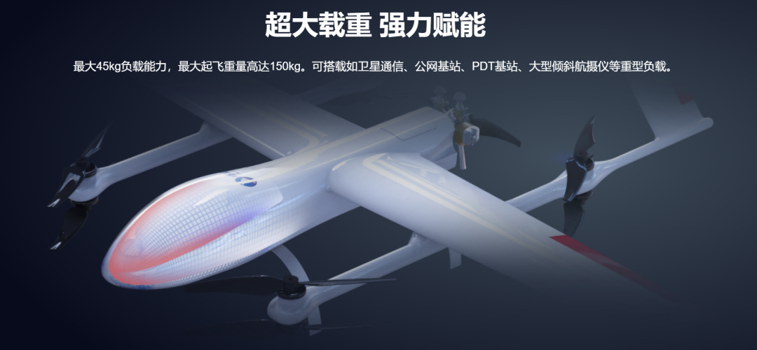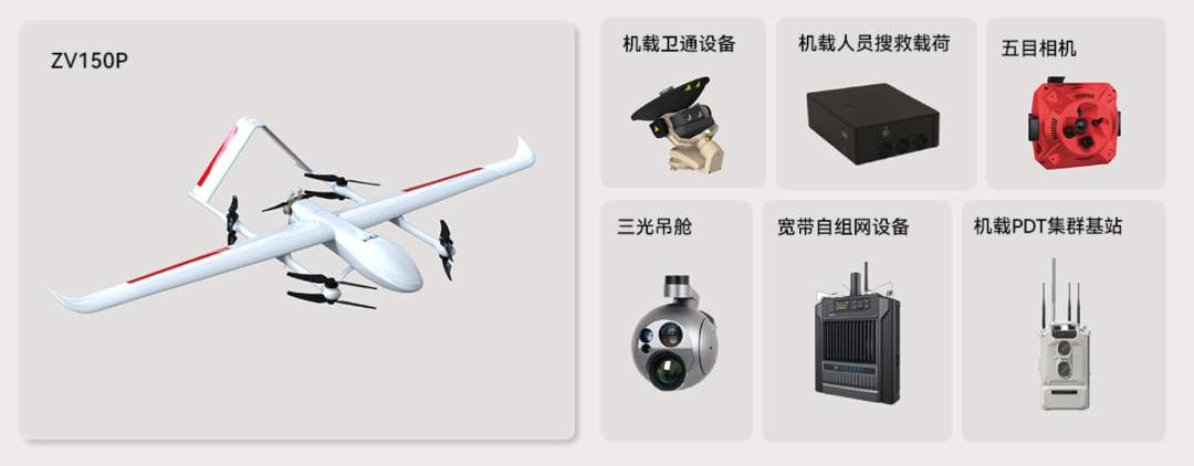 ZV150P复合翼无人机系统是卓翼智能全栈自研的无人装备智能系统,以其先进的技术和卓越的性能,成为应急通讯、应急救援、环境监测、地质勘查等多个领域的理想选择。该无人机采用油电混合动力系统,具备长航时和大载重的优势,能够连续飞行数小时,有效载荷达到数十公斤,搭载高性能机载卫星通信设备,配合大功率公专网基站,连续有效覆盖不少于110平方公里。其模块化设计使得可根据不同任务需求快速更换任务载荷,如高清摄像机、红外热成像仪、激光雷达等传感器。