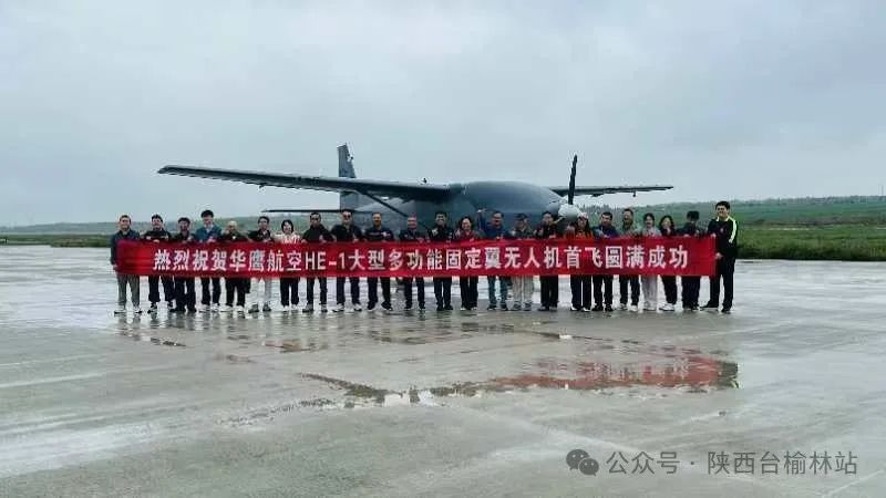 2024年9月7日早上6点58分,陕西华鹰众行航空科技有限公司仅历时18个月全自主研制的大型多功能固定翼无人机HE-1在爱生无人机试验测试靖边机场,迎着霏霏小雨,腾空起飞,空中飞行45分钟,实现首飞。