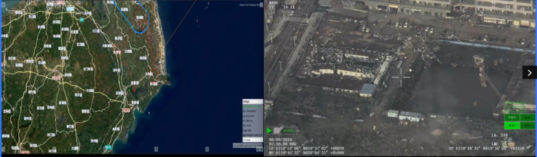 根据放飞指令,翼龙-2H应急救灾型无人机从福建三明机场起飞,9月8日04时03分到达文昌市目标区域,对文昌市铺前镇,锦山镇、龙楼镇,东郊镇、抱罗镇,文诚镇、潭牛镇等12个受灾乡镇进行了勘察。翼龙-2H应急救灾型无人机搭载了三大运营商公网基站,累计公网覆盖面积约1000平方公里、飞行保障时长4小时11分钟、接入通信信号1903人次、激活用户数522人次、建立通话112次、通话时长120.4分钟,并向省航空应急救援指挥调度平台实时回传灾区画面,保障地面救援人员通信。