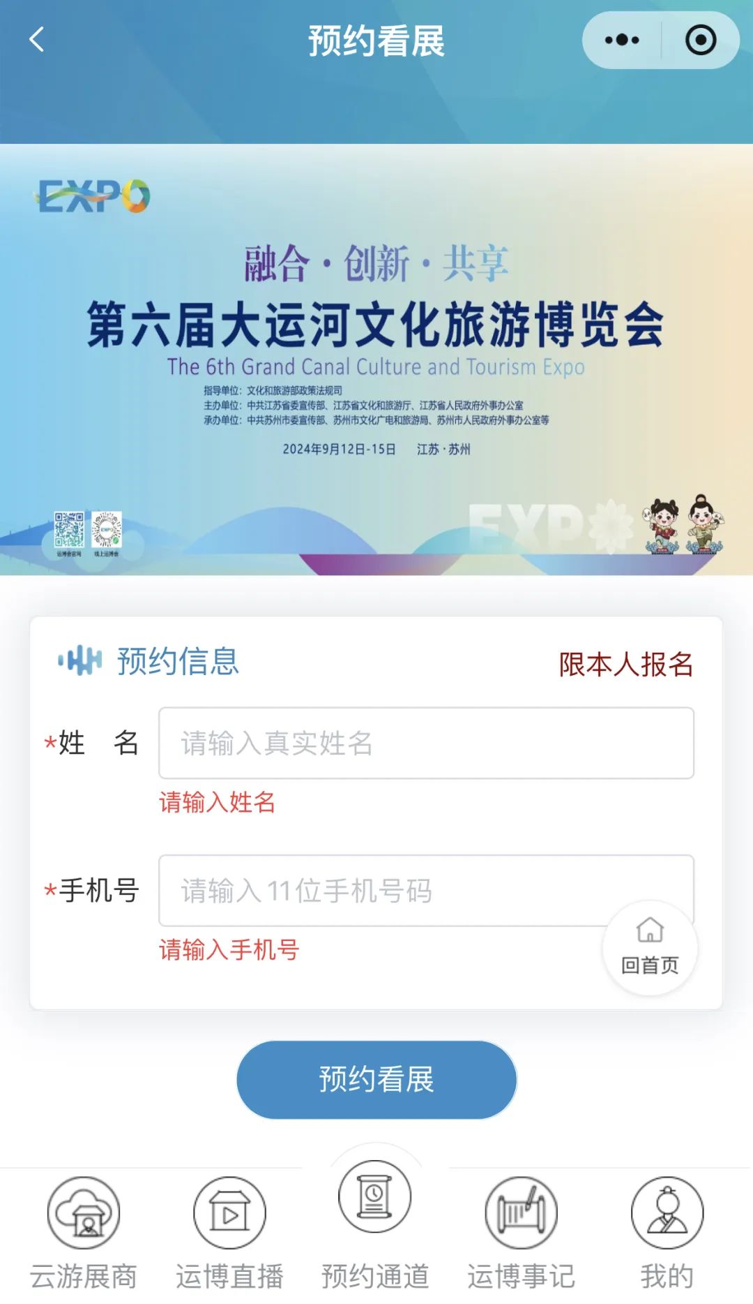 微信搜索「第六届大运河文化旅游博览会」小程序,在主页底部菜单栏点击“预约通道”中的“预约看展”即可进入预约页面。