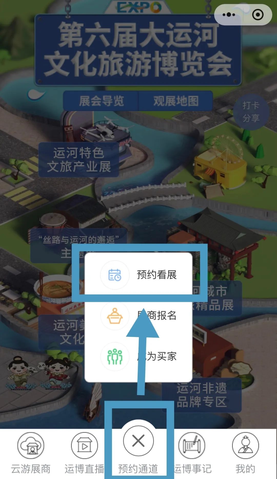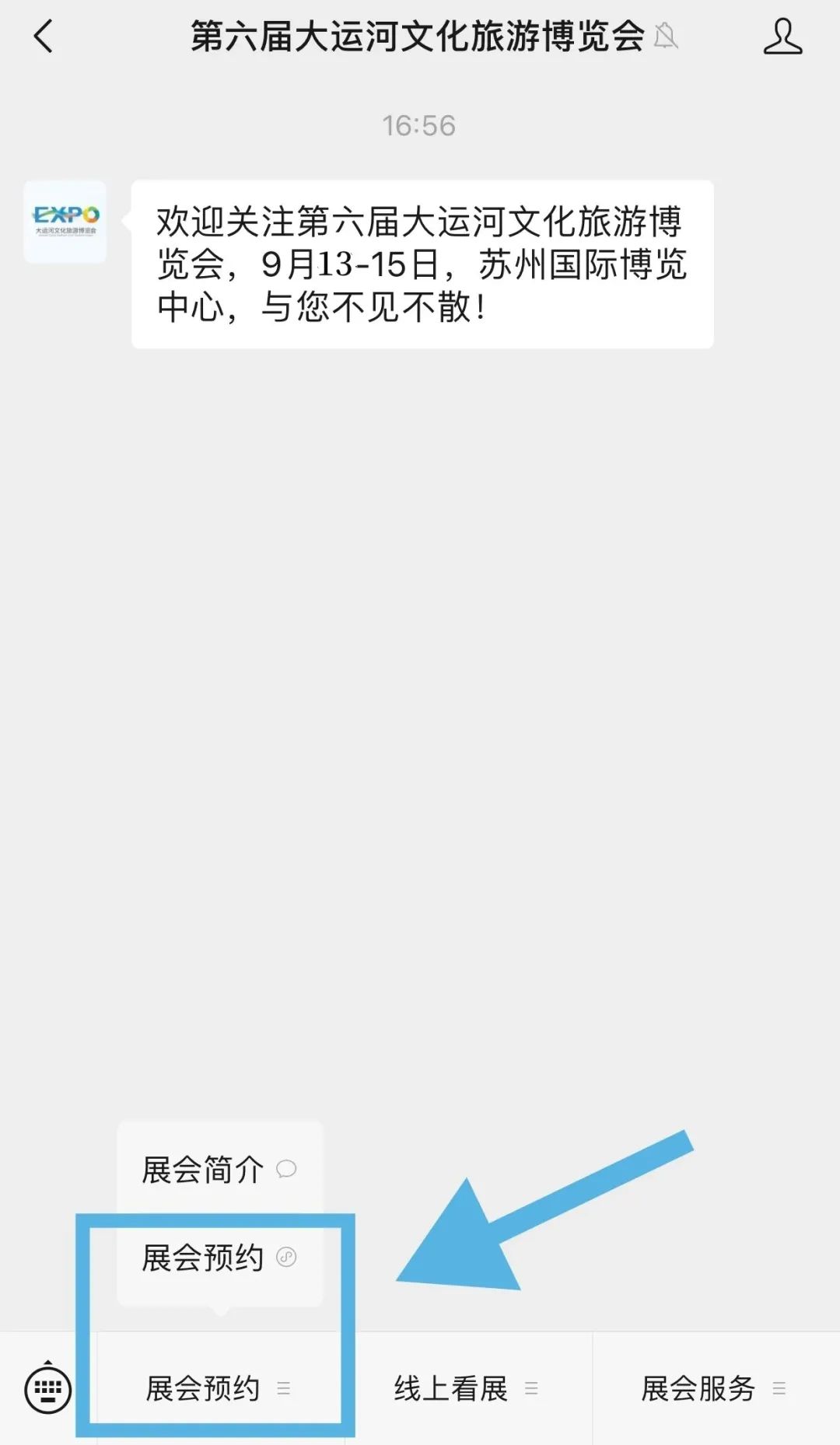 关注「第六届大运河文化旅游博览会」微信公众号,在公众号主页菜单栏左下角点击“展会预约”即可进入预约页面。