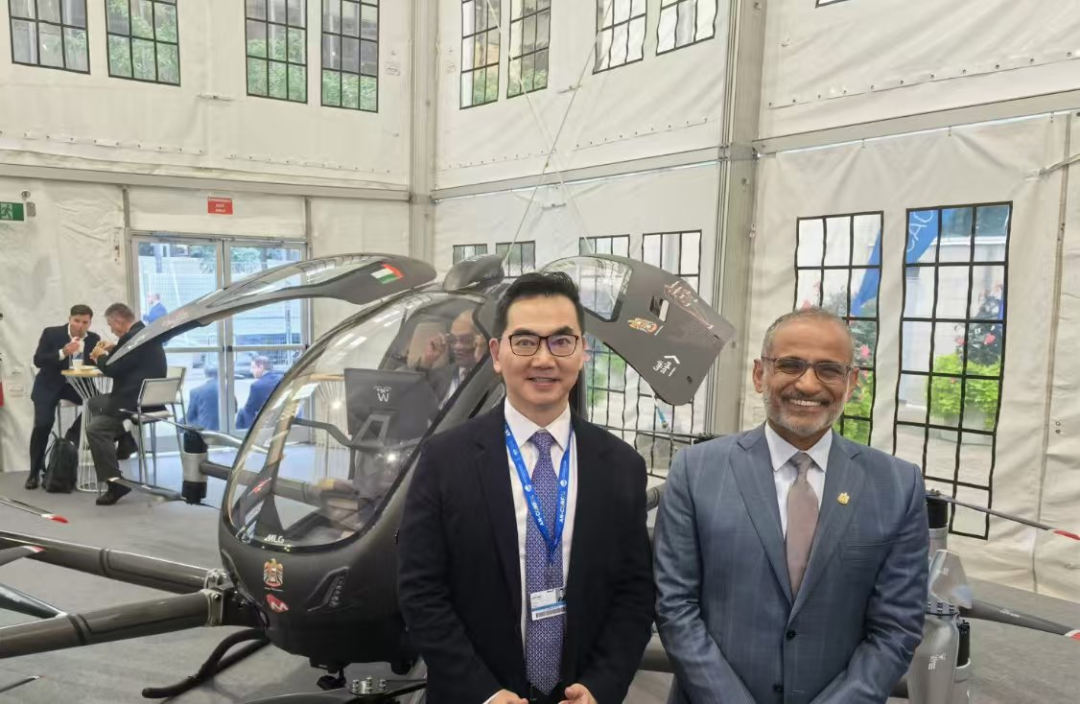 亿航智能首席财务官杨嘉宏(左)和阿联酋民航局局长赛义夫·穆罕默德·苏瓦伊迪阁下(H.E. Saif Mohammed Al Suwaidi)(右)