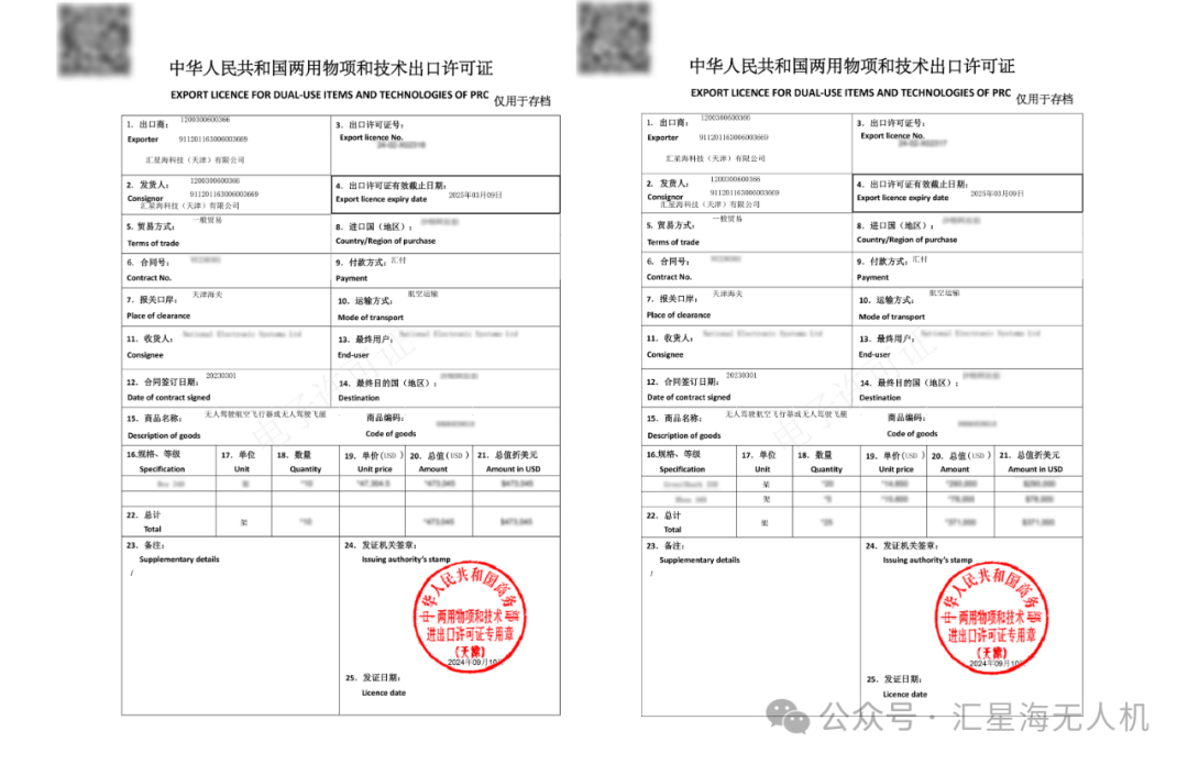 汇星海科技严格遵守《中华人民共和国出口管制法》《中华人民共和国对外贸易法》《中华人民共和国海关法》和商务部、商务部公告2024年第31号(《关于优化调整无人机出口管制措施的公告》)的相关规定,在天津市商务局和中国商务部的大力支持下,汇星海科技(天津)有限公司于近期成功获得两份“两用物项和技术出口许可证”,(HS编码:8806939010,千克<最大起飞重量≤25千克的其他无人驾驶航空器| 两用物项和技术出口管制的)。