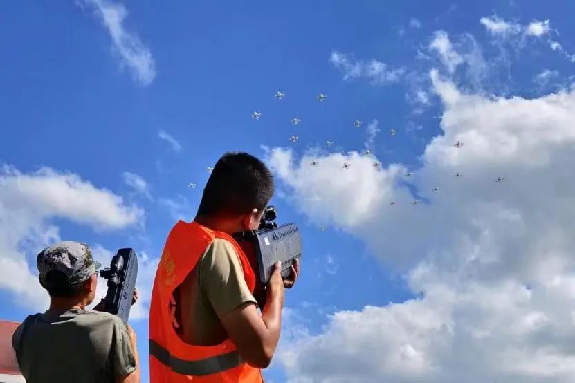 9时18分,随着防空袭“预先警报”响起,参与演练的师生迅速向人防掩蔽场所疏散,社区居民在指挥人员的组织下有序向草邦水库疏散基地紧急转移。我院组织无人机迅速升空,进行喊话有组织的指挥人员疏散。随后,30架无人机模拟空袭,朝我区域目标飞来,反无人机专业队通过无线电侦测拦截系统发现不明无人机群入侵,得到拦截打击指令后,立即精准驱离,守护一方平安蓝天。