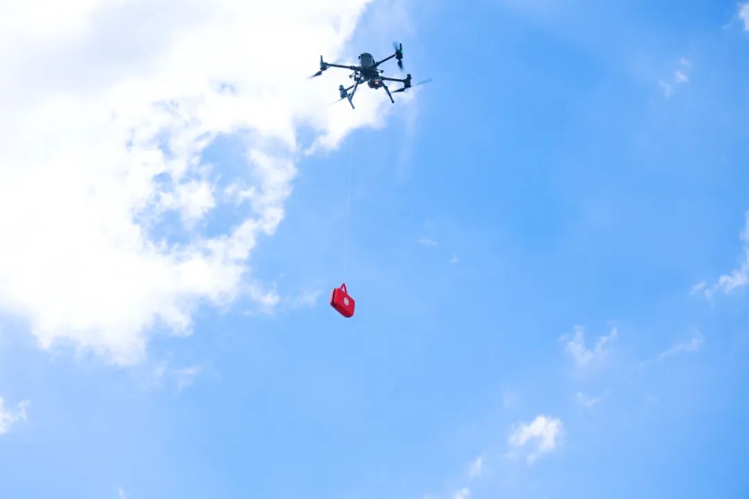 在模拟救援过程中,经医务人员检查发现伤员失血过多,需及时补充血液,否则危及生命,医务人员立即向指挥所申请支援,指挥保障中队利用无人机定点投送物资。