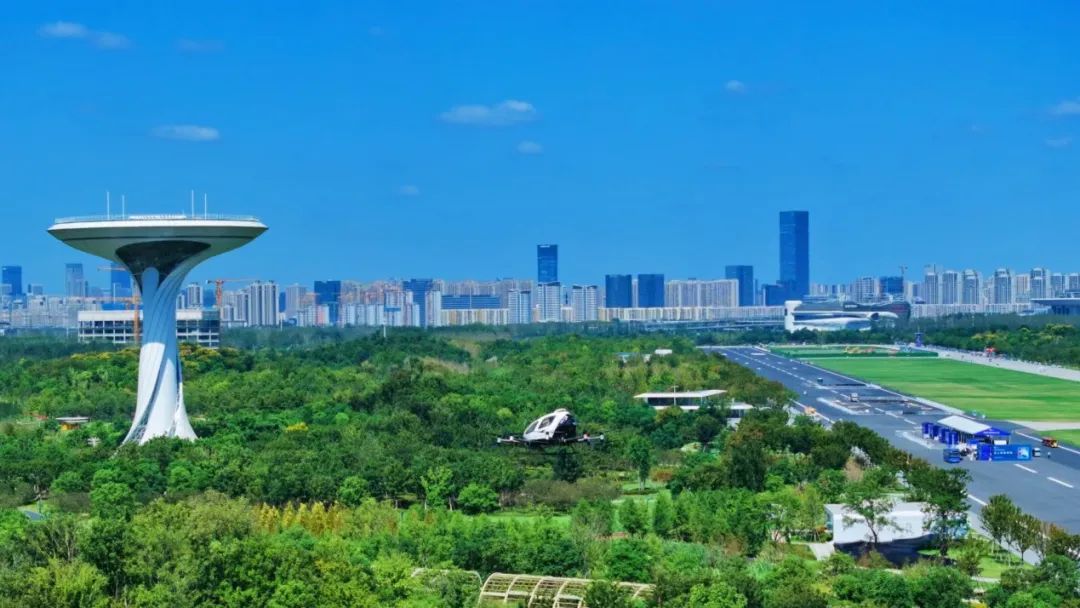 大会期间,EH216-S无人驾驶载人航空器在合肥合肥骆岗公园做飞行场景展示