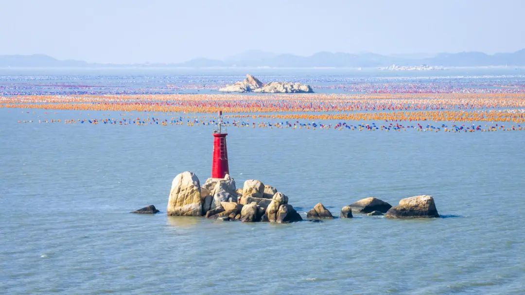 上万亩牡蛎养殖“海上牧场”采用成片可降解的彩色透明浮球进行吊养。五颜六色的浮球方阵在阳光下熠熠生辉。