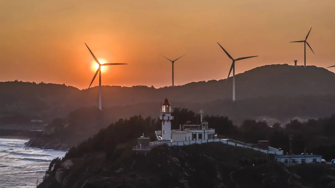 航拍有汕头好望角之称的表角灯塔,航拍大海日落灯塔和风车