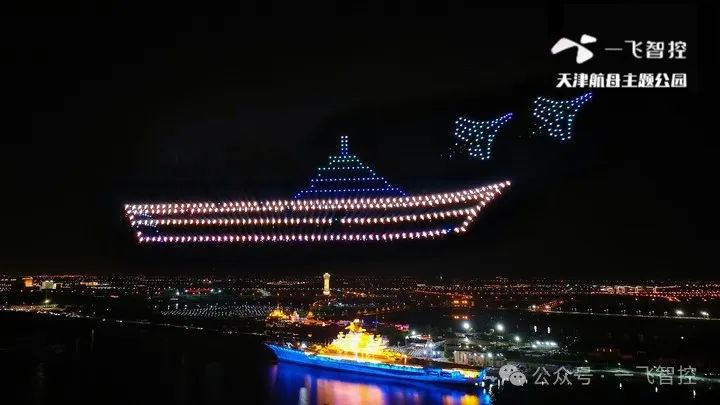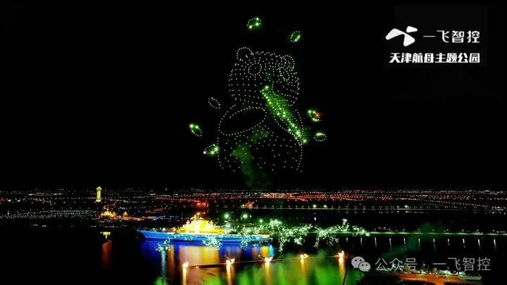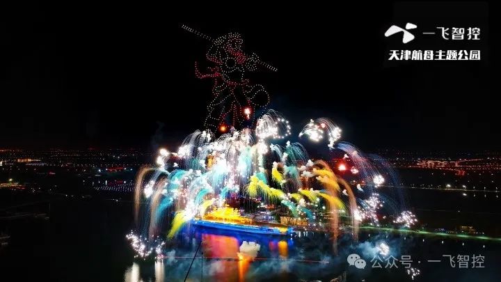 无人机在空中排列出“航空母舰” “山河无恙,国泰民安”等画面,还巧妙地变换成传统神话人物“哪吒”和“孙悟空”,以及可爱的“熊猫”等形象,向祖国传递了深情的祝福。与此同时一飞智控的无人机烟花秀品牌效应,成功为航母吸引大量游客。据统计,7天内园区接待游客16.3万人次,10月2日至6日的夜场接待量达6万人次,天津航母主题公园在文旅市场中“强势出圈”!