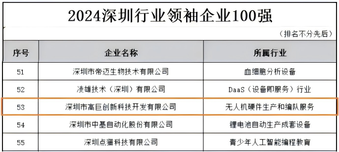 10月9日,深圳市行业领袖企业发展促进会、深圳商报/读创客户端联合发布“2024深圳行业领袖企业100强”榜单。高巨创新凭借在无人机硬件生产和编队服务领域的杰出成就与开创性引领作用,成功荣登该榜单,充分展示了其在业界的领航地位及非凡实力。