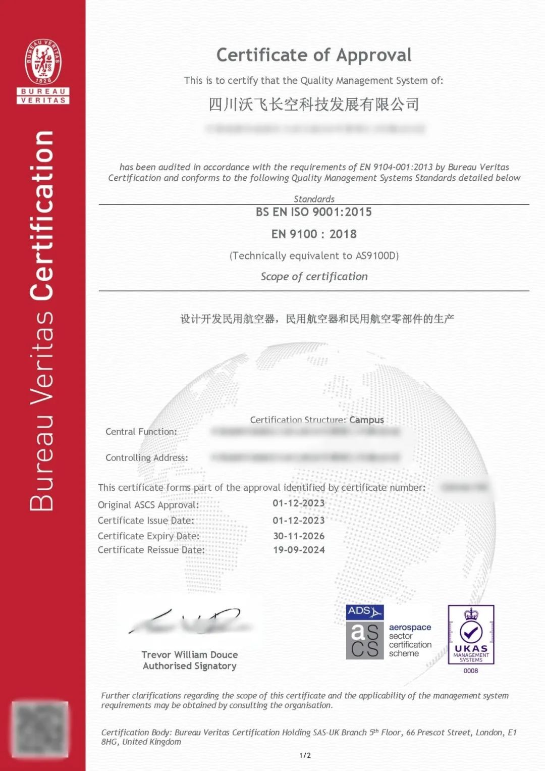 此前沃飞长空获得必维国际检验集团颁发的AS9100D认证证书后,对内持续优化公司体系流程,并在短时间内完成生产范围扩项认证,进一步提升了公司整体质量管理水平。