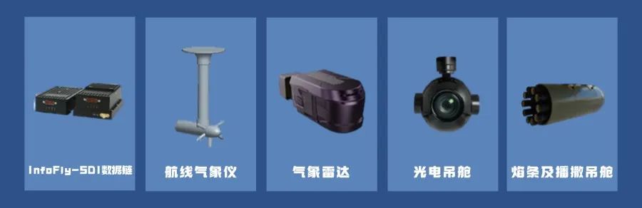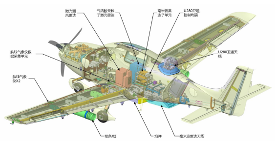 可搭载多种气象载荷,包含综合大气参数采集处理系统、机载激光测风雷达、雨滴谱仪、焰条播撒吊舱系统等。具备前起落架、主起落架收放功能。任务载荷有快装快卸接口,可实现机体快速拆装、易损部件快速更换。配备应急/备份供电。